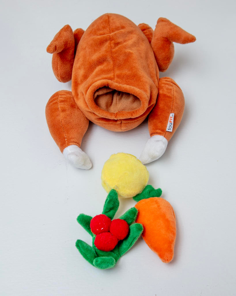 This plush turkey is filled with 3 mini toys for your dog to find. The cranberry toy features a fun crinkle material, while the lemon has a hidden ball shaped squeaker inside. The carrot features a hole to hide a treat in, adding another item to burrow for!
